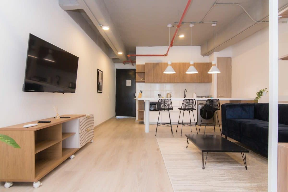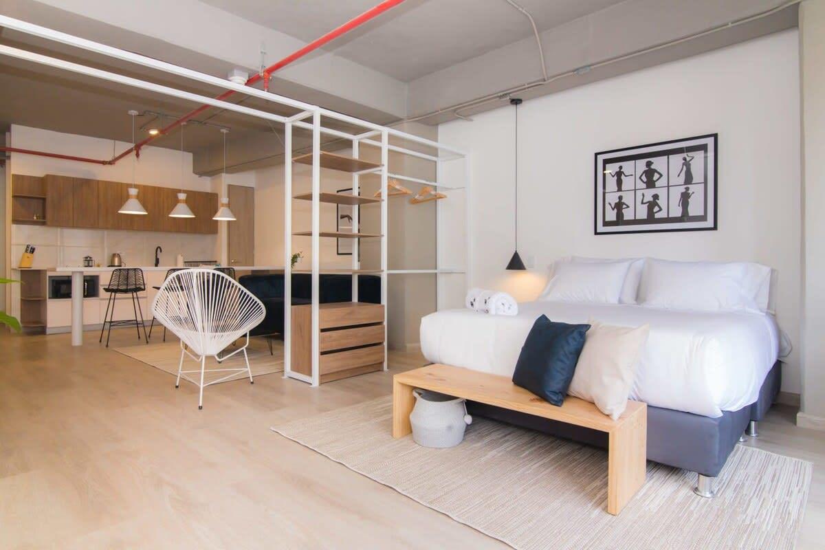 Located in the best area of ​​Medellin. This modern loft features, a queen size bed, a welcoming living room and a beautiful balcony. Ideal for business trips, families and small groups of friends who want to stay in a modern apartment with a great location. You will be walking distance to typical Colombian and international food restaurants, supermarkets, local art galleries, bars and cafes in the city.